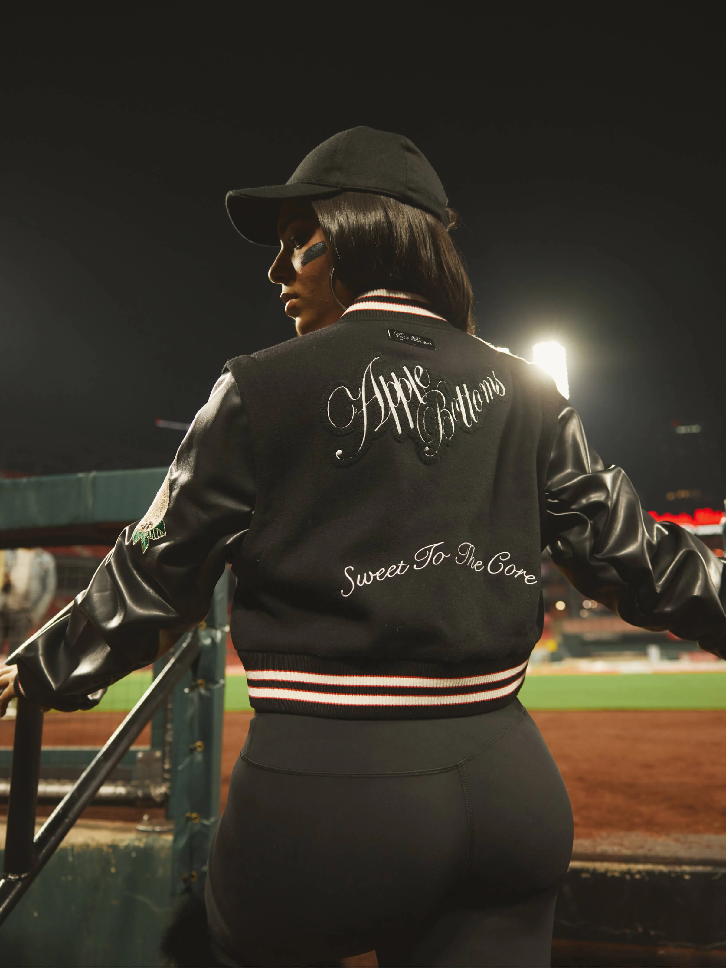Elevate your outerwear game with The Apple Varsity Jacket. Featuring a cropped silhouette and stylish combination of wool and vegan leather, this jacket stands out with its bold embellished patches and signature design. Whether you're rocking it with sleeves or converting it into a vest, the detachable sleeves give you versatility for any occasion. Fully lined for comfort, this jacket is the perfect blend of cozy and cool for day-to-night style.
